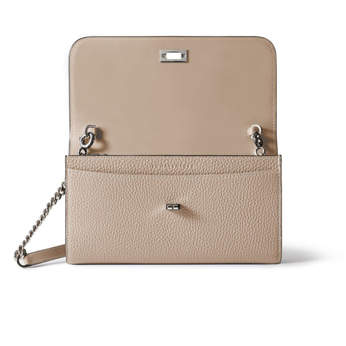 - The shoulder strap combines elegance and calmness with a combination of chain and leather.